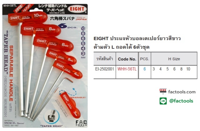 รหัสสินค้า: FACEI-2502001 ประแจหัวบอลเตเปอร์ยาวสีขาว EIGHT ด้ามตัว L ถอดได้ รุ่น WHH-S6TL (ชุด 6ชิ้น)