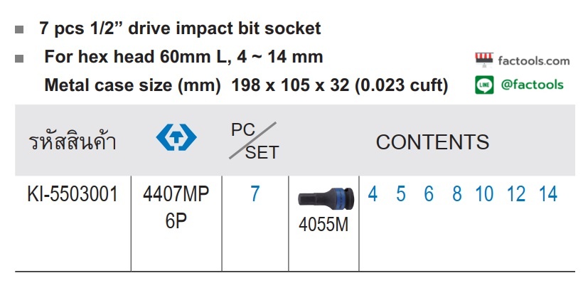 FACKI-5503001 ลูกบ๊อกเดือยโผล่ลม สั้น รู 1/2" KINGTONY รุ่น 4407MP 6P (ชุด 7ตัว)
