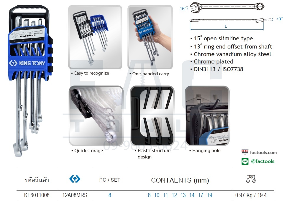 FACKI-6011008 ประแจแหวนข้างปากตายตัวยาว KINGTONY รุ่น 12A08MRS (ชุด 8ตัว)