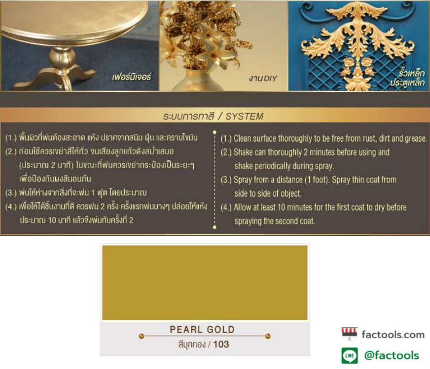 สเปรย์สีทองเกรดพิเศษ อะคริลิคแท้ 100% ผสมผงสีทองคุณภาพสูง ให้ความสวยงามสง่า เปล่งประกายดุจทองคำแท้ ด้วยเทคโนโลยี MIRACLE GOLD EFFECT ช่วยให้สะท้อนแสง ได้มากแม้ในที่แสงน้อย ตอบสนองทุกการใช้งานสีทอง