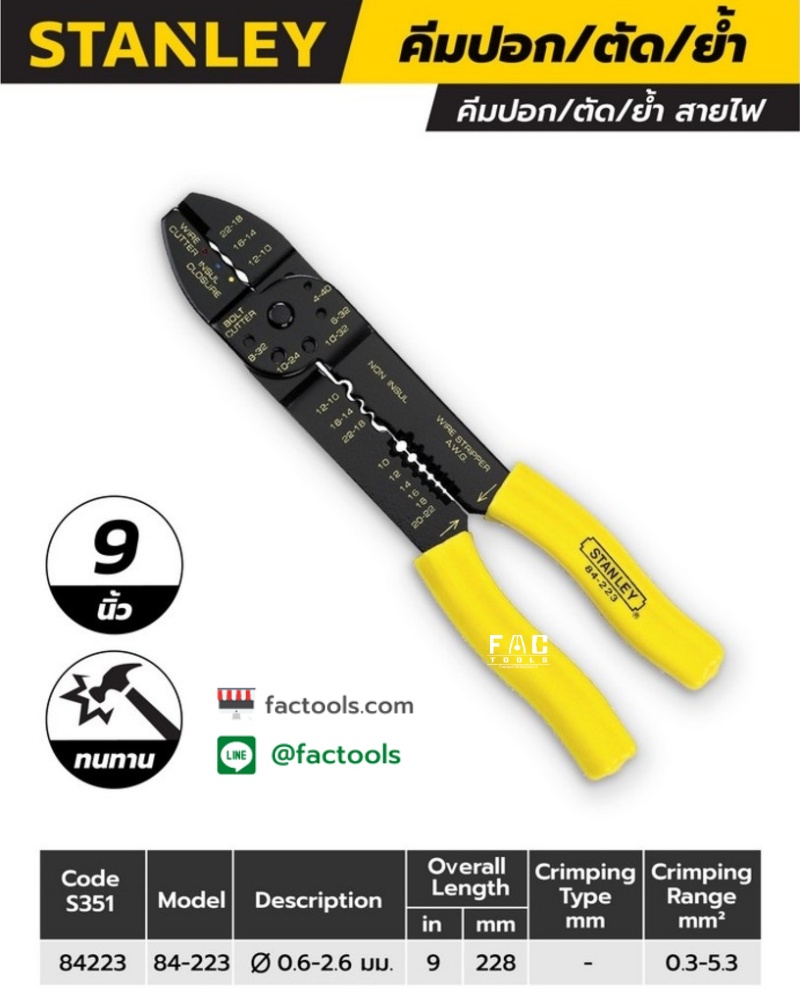 FACS351-84223 คีมปอก/ตัด/ย้ำ สายไฟ 9" STANLEY รุ่น 84-223