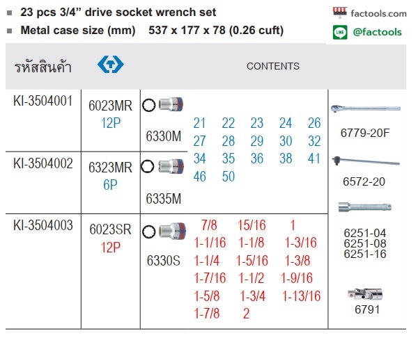 FACKI-3504001 บ๊อกชุด รู 3/4" KINGTONY รุ่น 6023MR 12P KI-3504001 (ชุด 23ตัว)