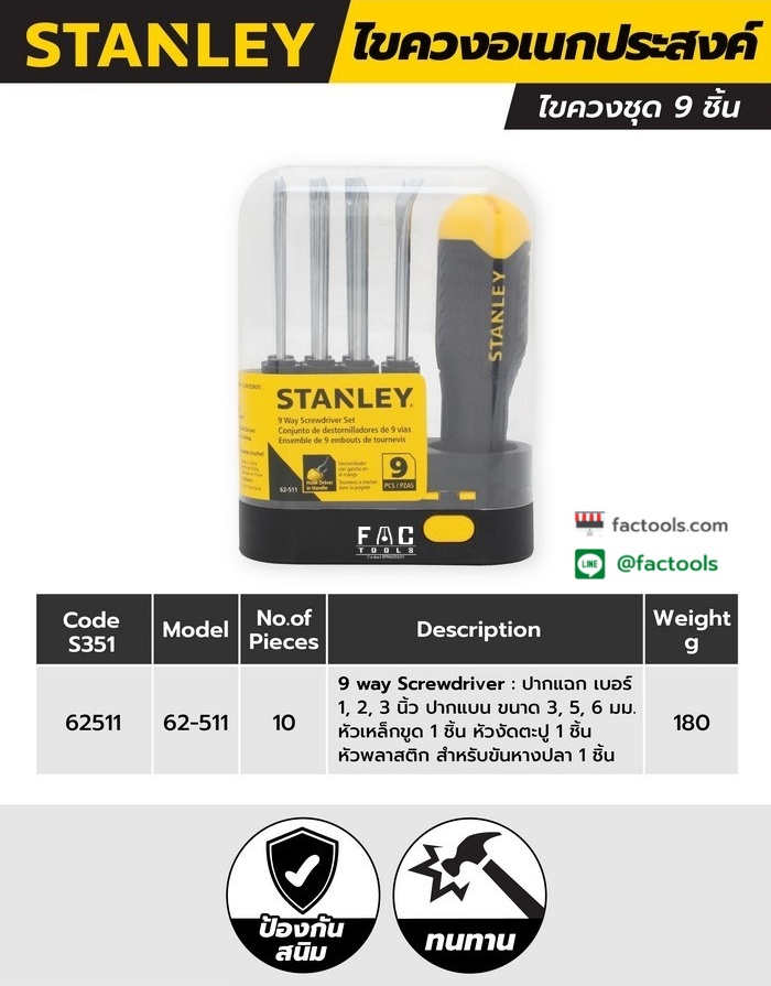 FACS351-62511 ไขควงเปลี่ยนหัวได้ STANLEY #62-511 (ชุด 9ชิ้น)